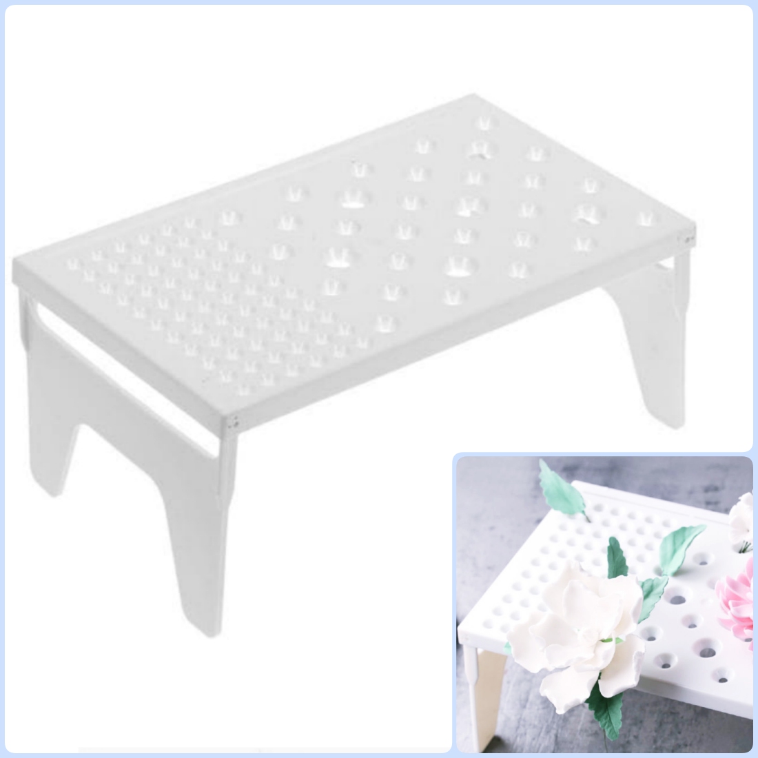 Столик для сушки цветов будет полезным приспособлением как профессионалам, так и любителям в их кондитерском деле, предназначен для удобства в работе. Порядок и чистота в рабочей зоне, как дополнительный бонус.